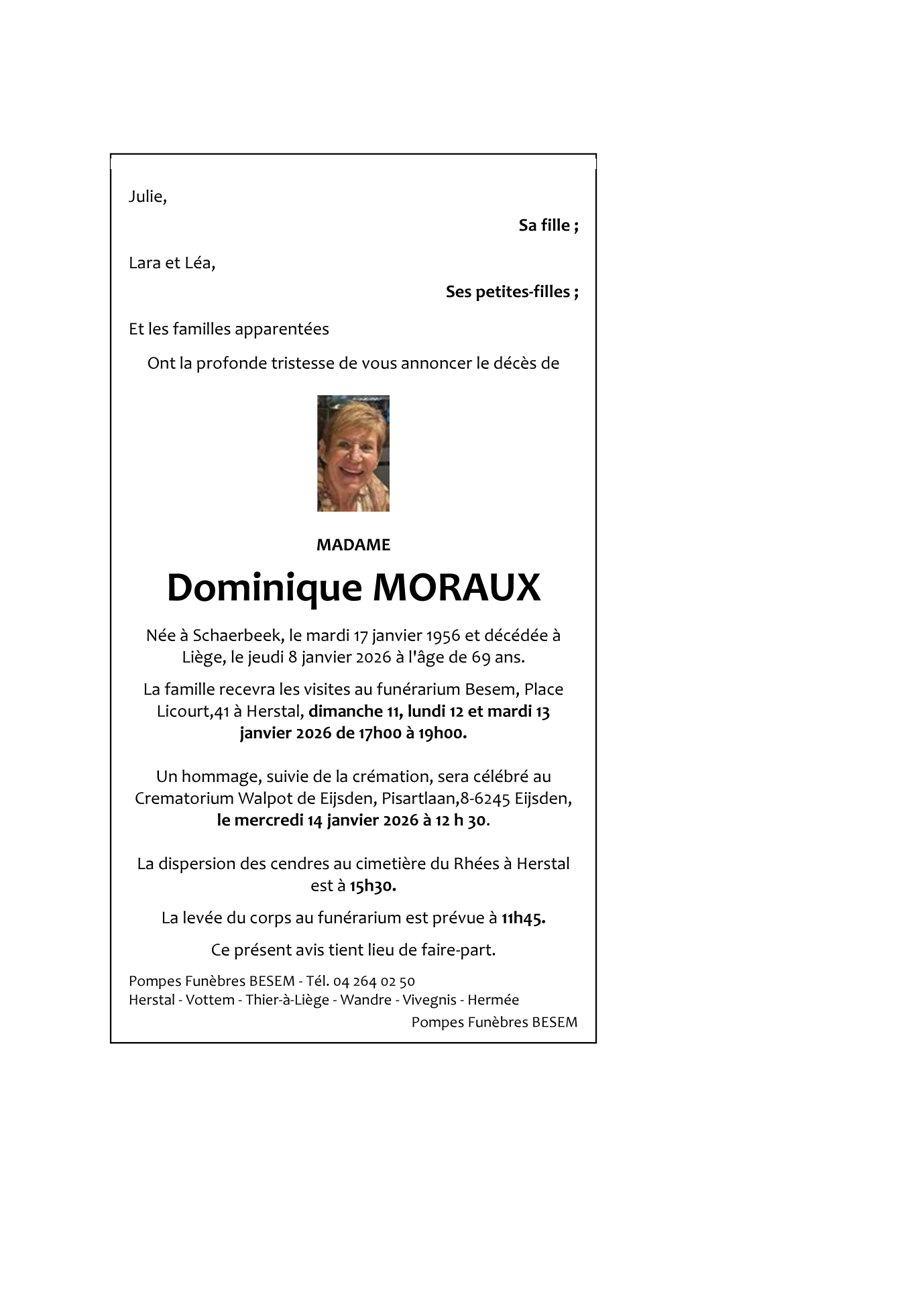 Décédée à Liège (4000) le jeudi 8 janvier 2026 à l'âge de 69 ans