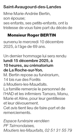 Décédé à Saint-Avaugourd-des-Landes (85540, France) le mercredi 10 décembre 2025 à l'âge de 69 ans