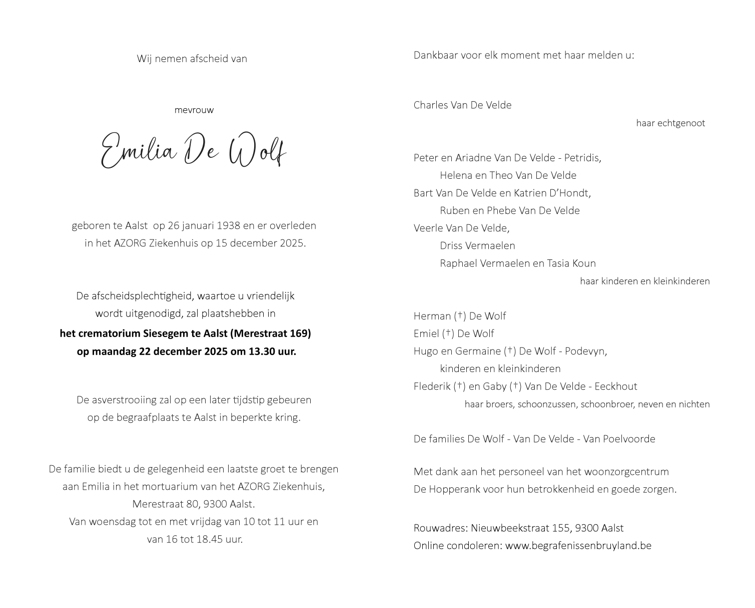 Décédée à Aalst (9300) le lundi 15 décembre 2025 à l'âge de 87 ans