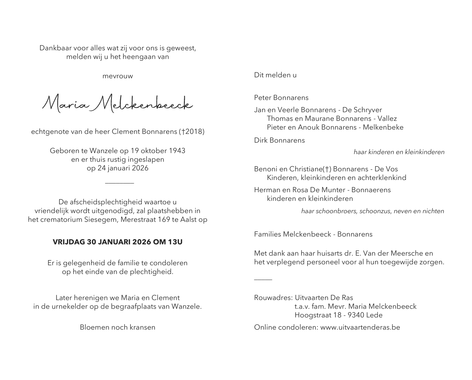 Décédée à Wanzele (9340) le samedi 24 janvier 2026 à l'âge de 82 ans