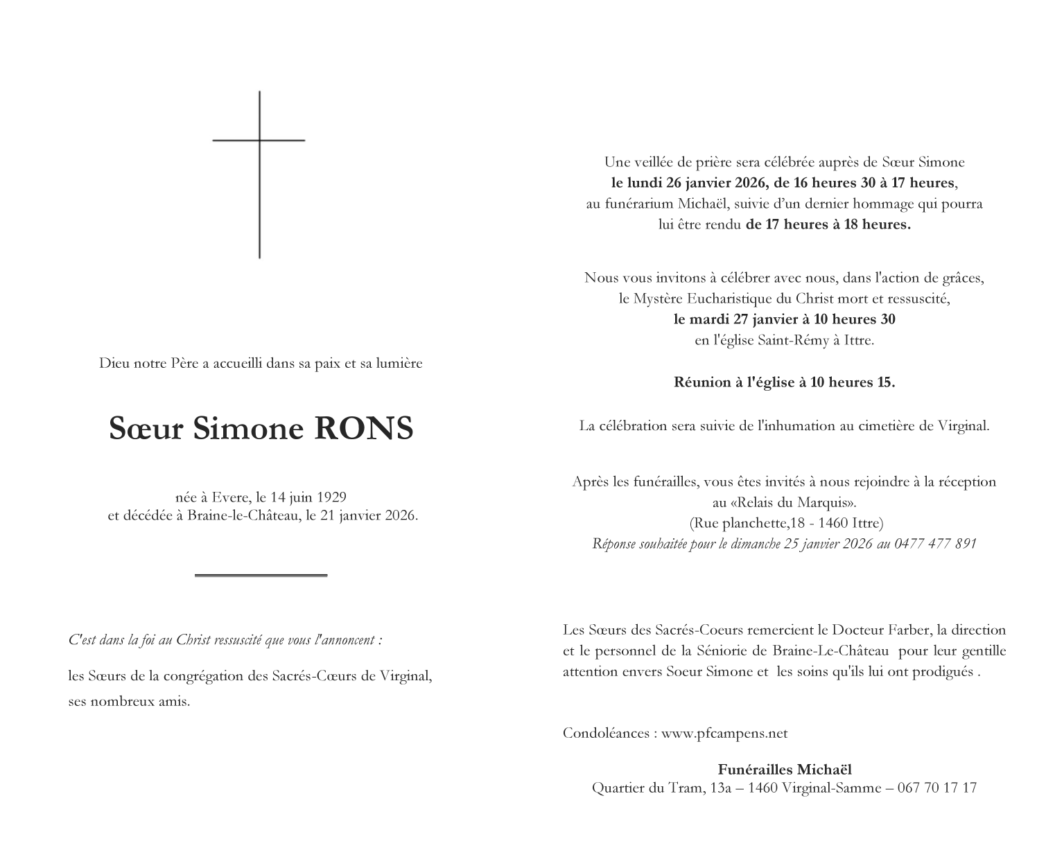Décédée à Braine-le-Château (1440) le mercredi 21 janvier 2026 à l'âge de 96 ans