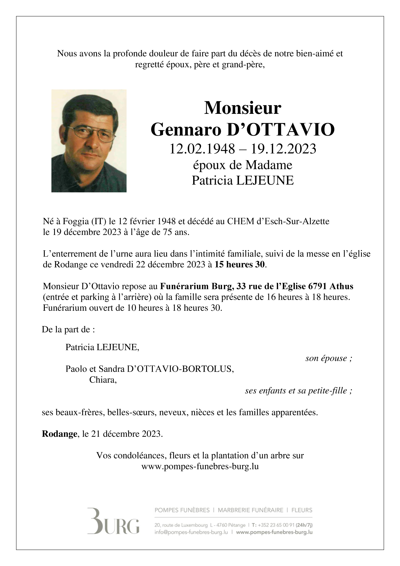 Décédé à Esch-Sur-Alzette/Mayrisch  (4240, Luxembourg) le mardi 19 décembre 2023 à l'âge de 75 ans