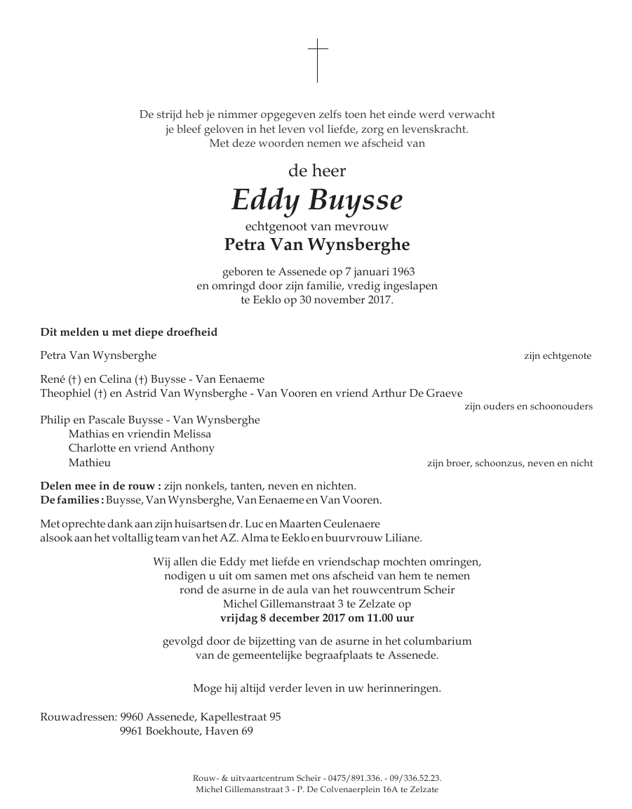 Décédé à Eeklo (9900) le jeudi 30 novembre 2017 à l'âge de 54 ans