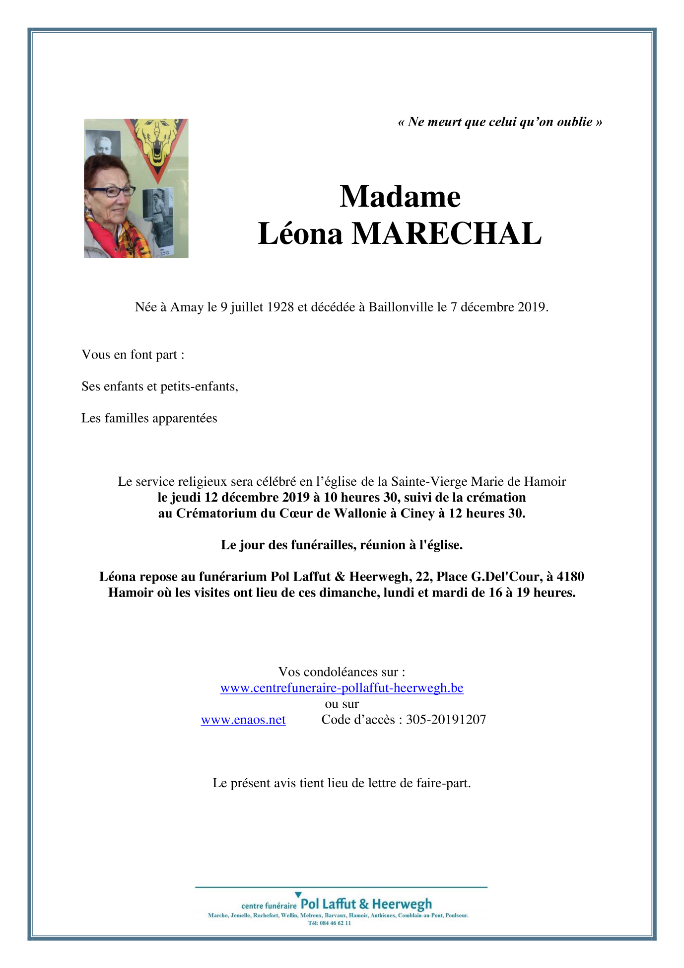 Fallecida en Baillonville (5377) el sábado, 7 de diciembre de 2019 a la edad de 91 años