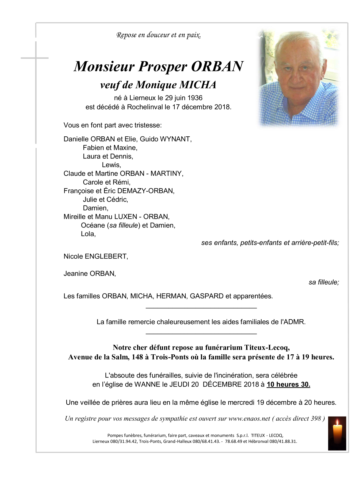 Fallecido en Rochelinval (4980) el lunes, 17 de diciembre de 2018 a la edad de 82 años