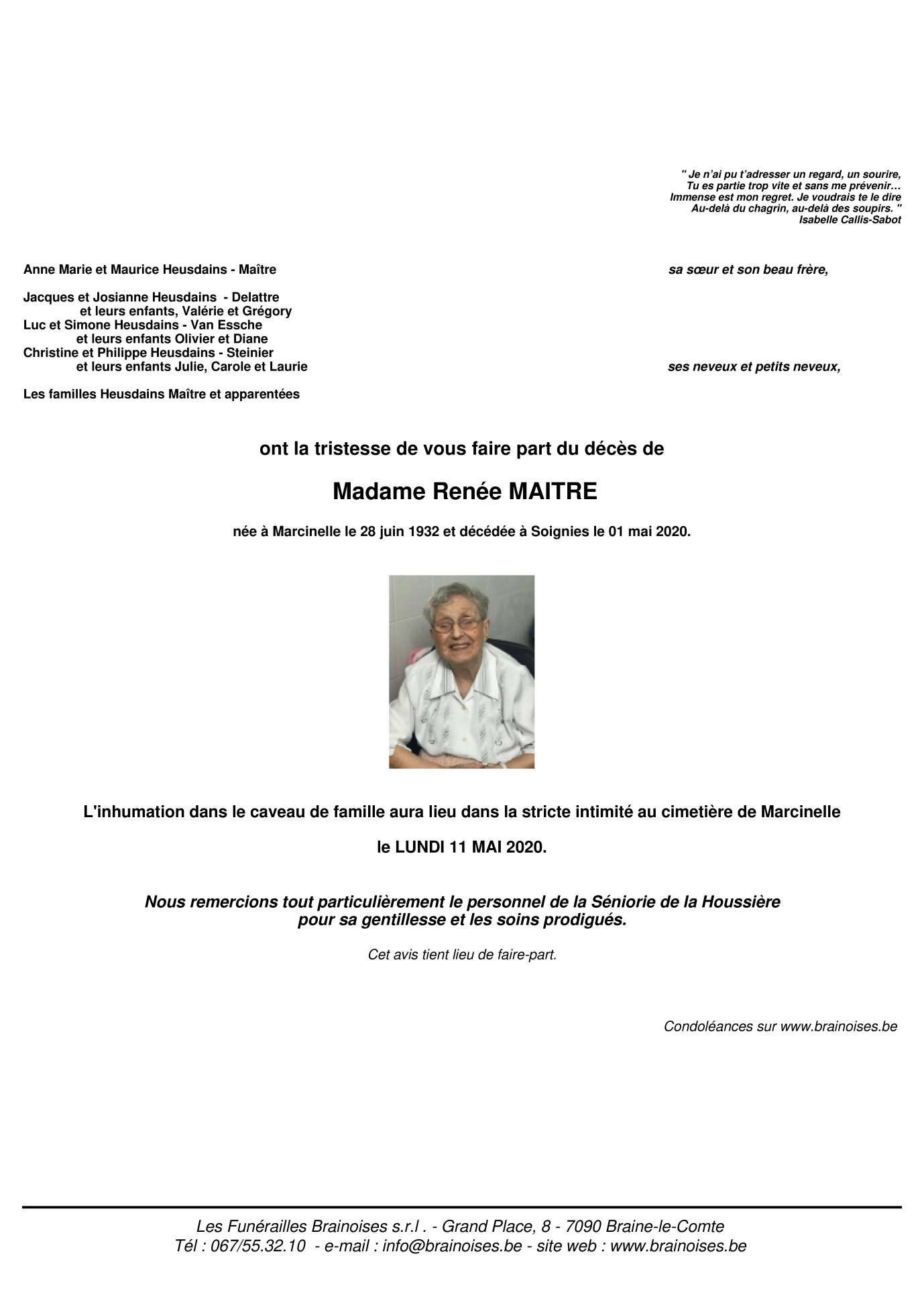 Décédée à Soignies (7060) le vendredi 1 mai 2020 à l'âge de 87 ans