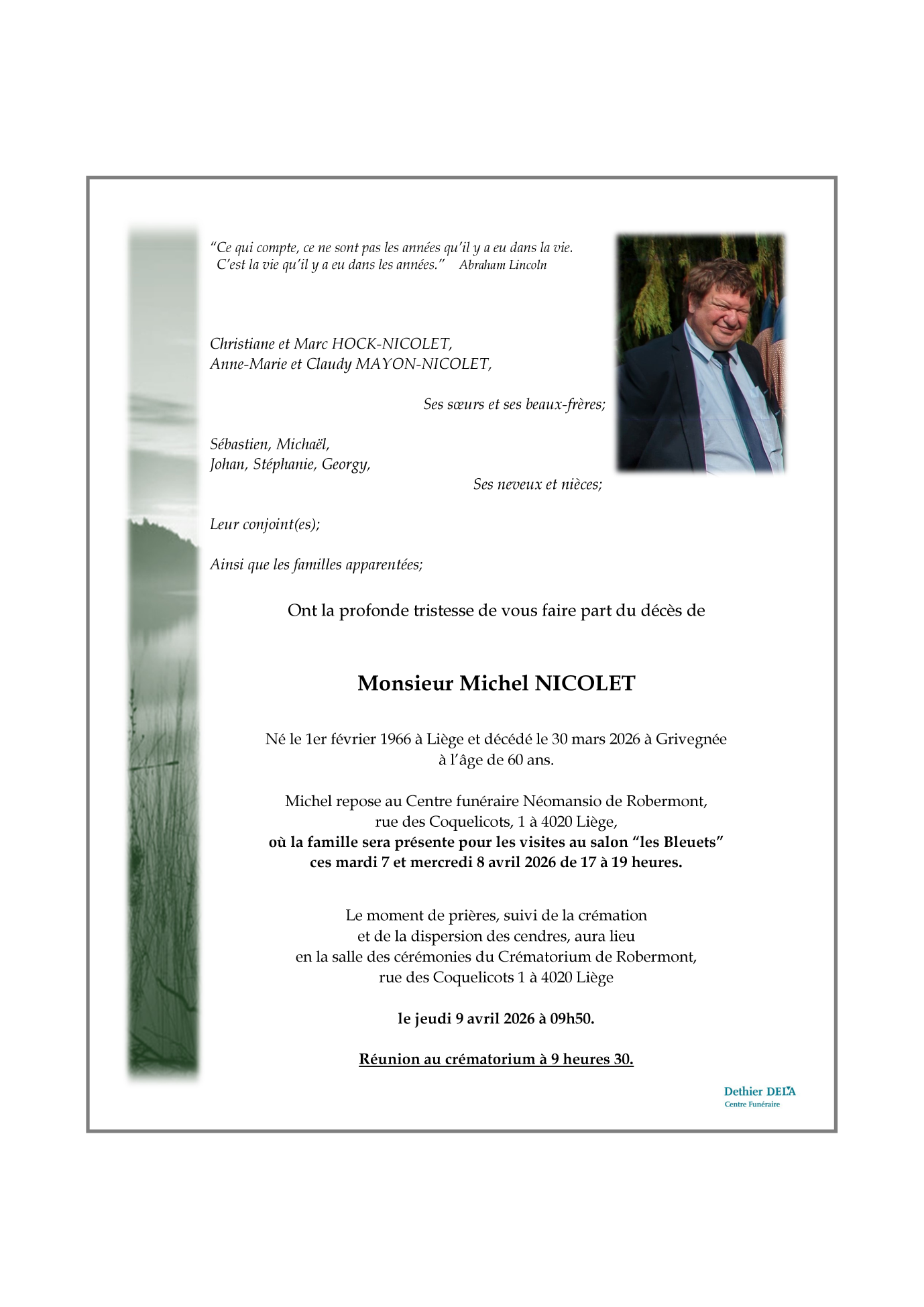 Décédé à Grivegnée (4030) le lundi 30 mars 2026 à l'âge de 60 ans
