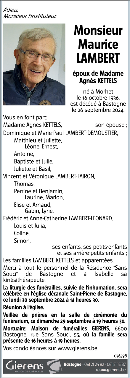Décédé à Bastogne (6600) le jeudi 26 septembre 2024 à l'âge de 87 ans
