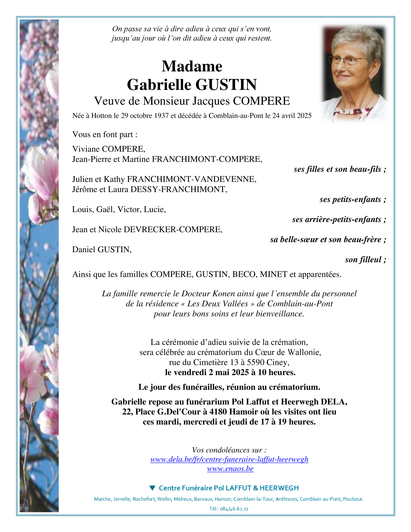Décédée à Xhoris (4190) le jeudi 24 avril 2025 à l'âge de 87 ans