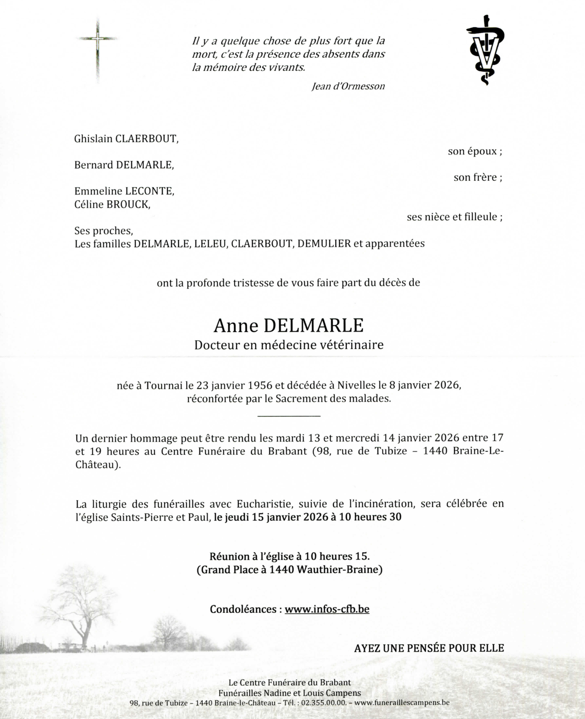 Décédée à Nivelles (1400) le jeudi 8 janvier 2026 à l'âge de 69 ans