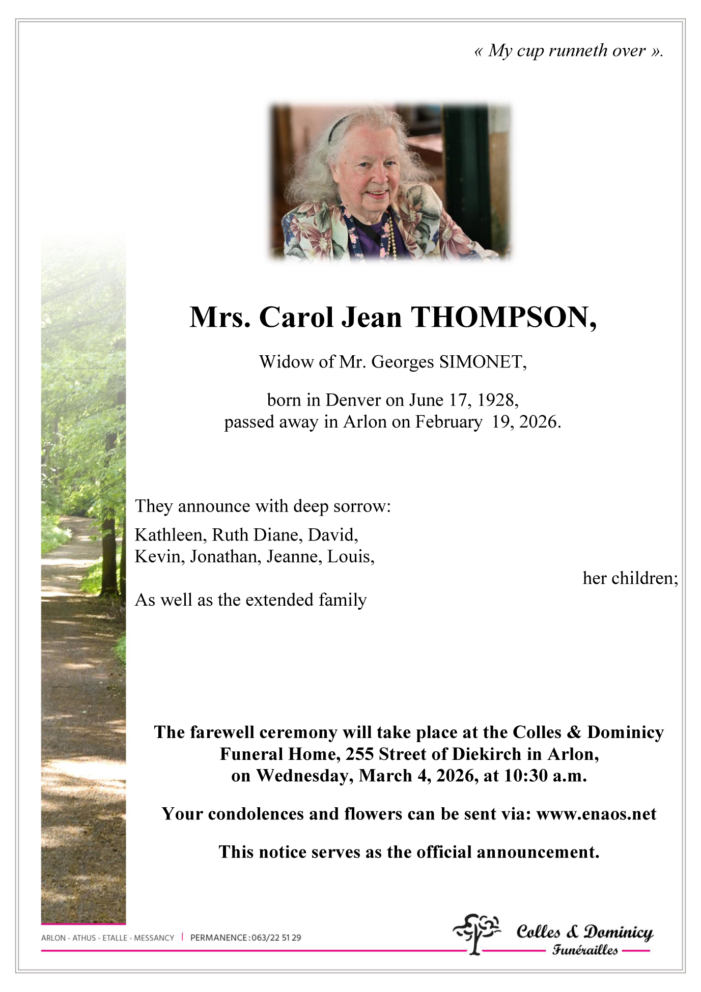 Décédée à Arlon (6700) le jeudi 19 février 2026 à l'âge de 97 ans