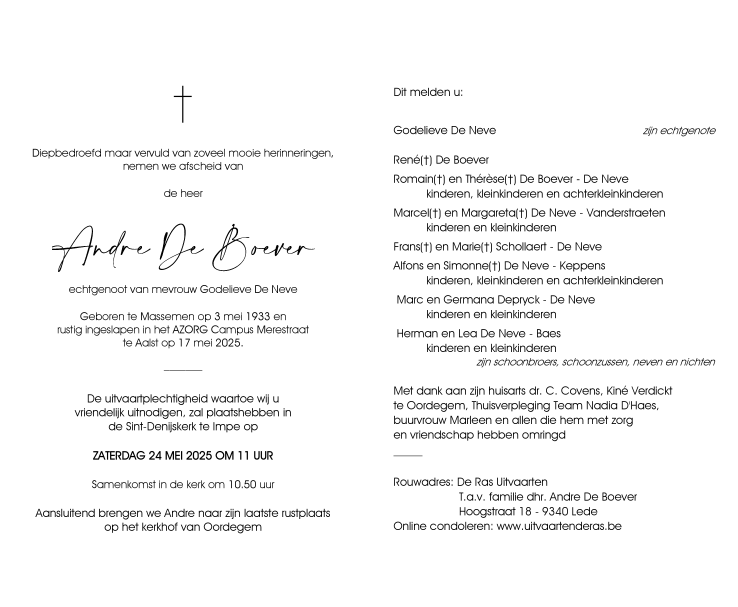 Overleden te Aalst (9300) op zaterdag 17 mei 2025 op 92-jarige leeftijd