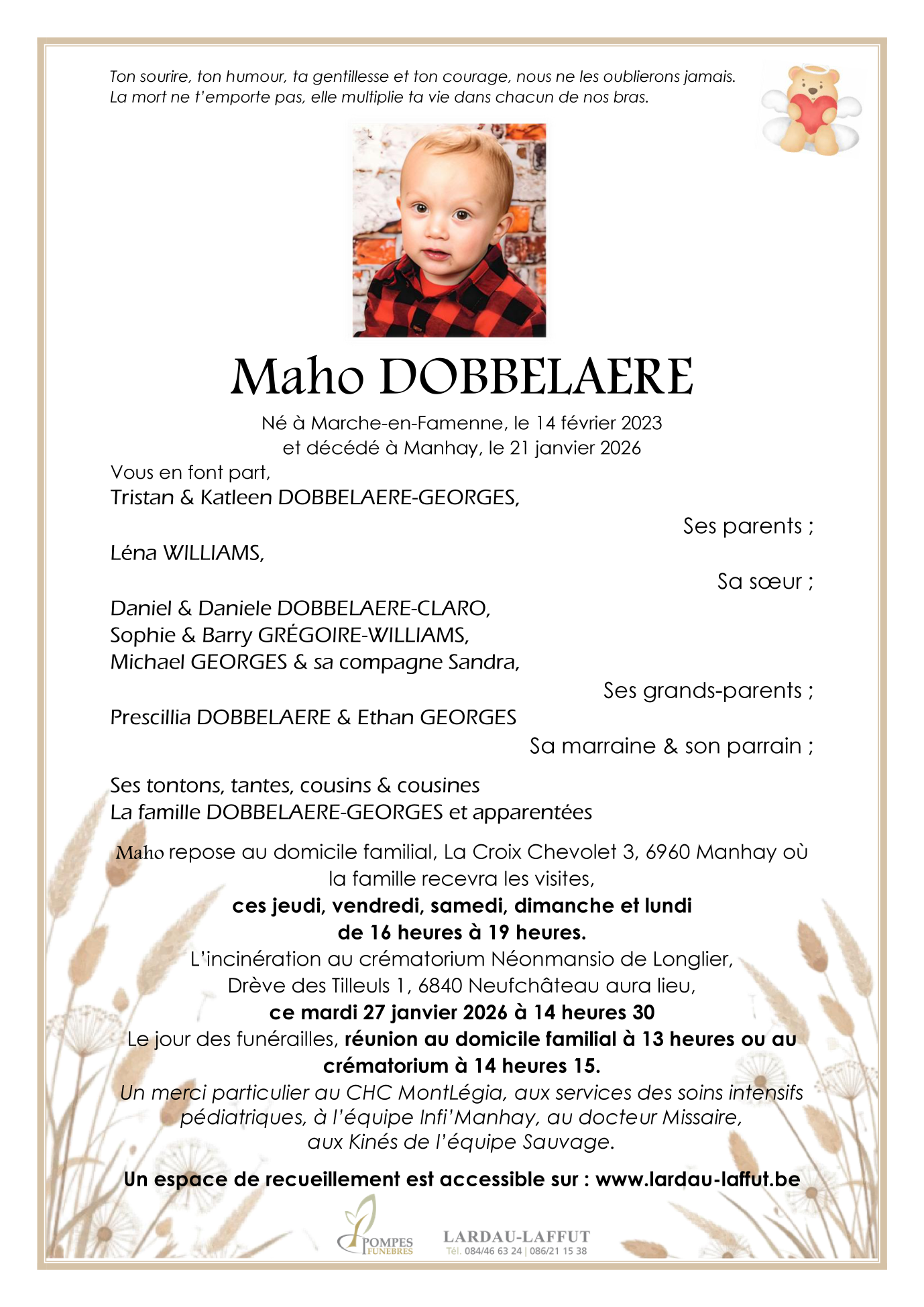 Décédée à Manhay (6960) le mercredi 21 janvier 2026 à l'âge de 2 ans