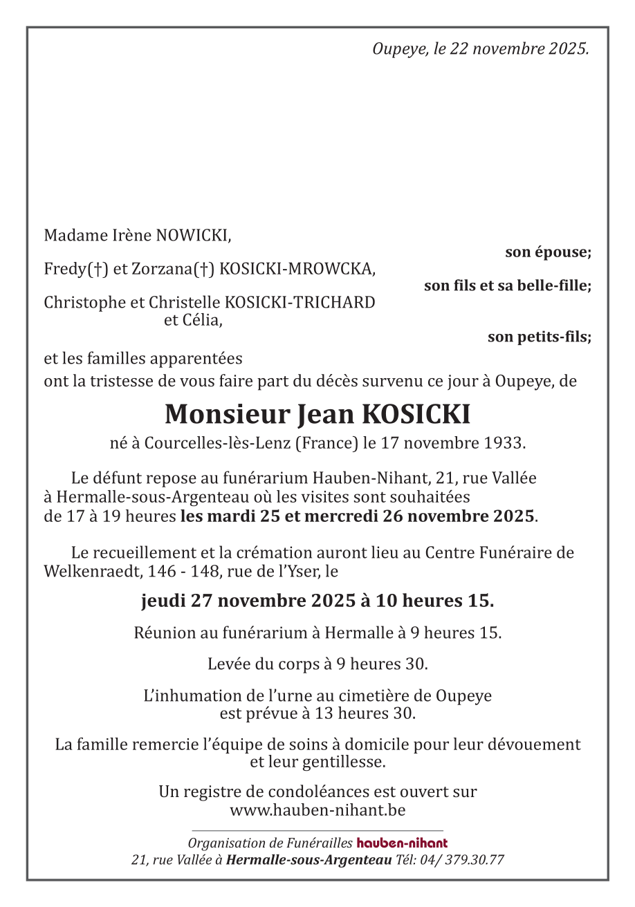 Overleden te Oupeye (4680) op zaterdag 22 november 2025 op 92-jarige leeftijd