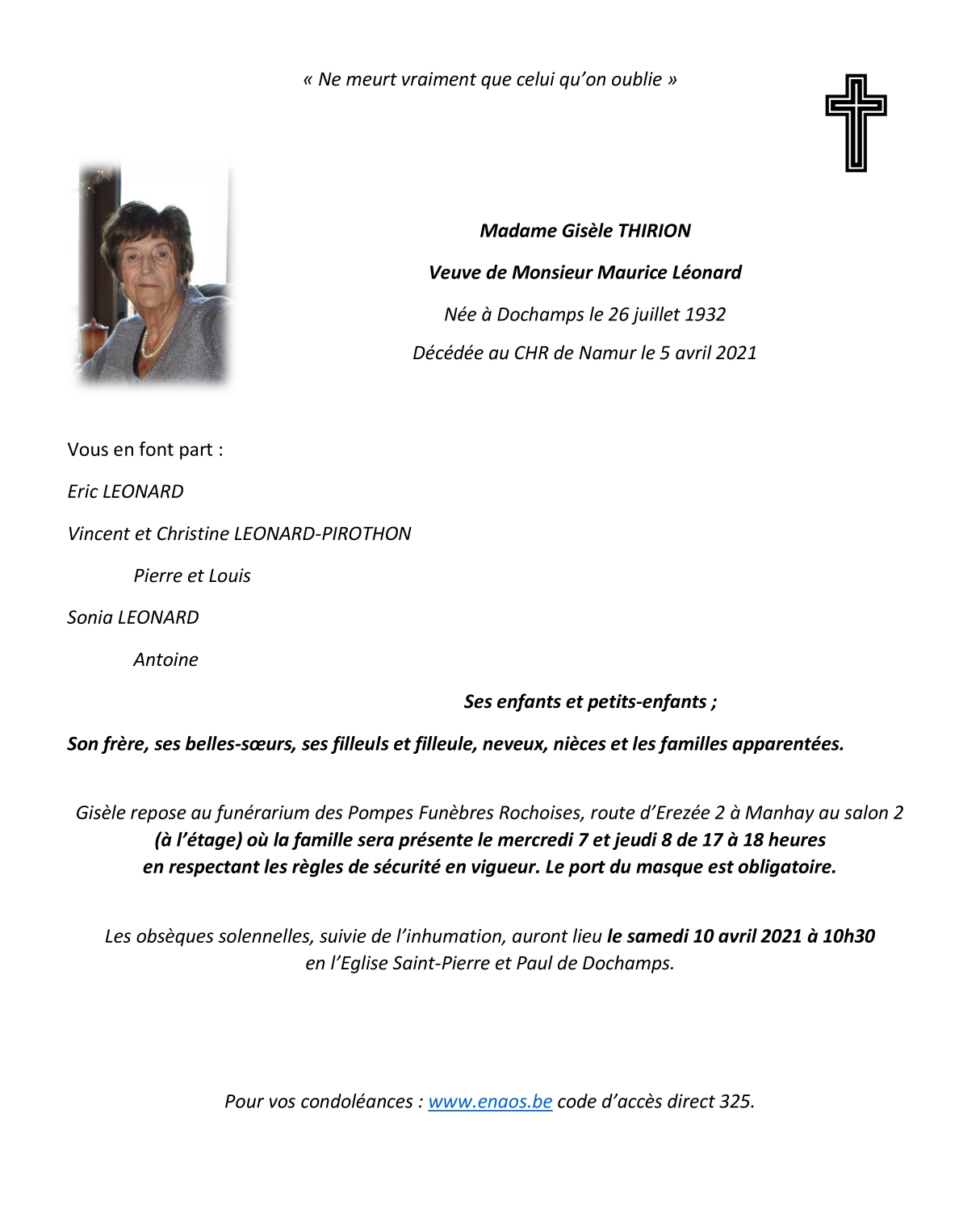Overleden te Namur (5000) op maandag 5 april 2021 op 88-jarige leeftijd