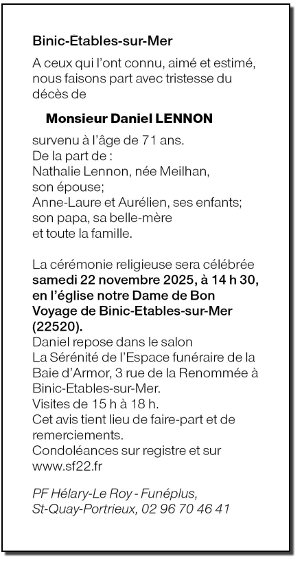 Décédé à Binic (22520, France) le lundi 17 novembre 2025 à l'âge de 71 ans
