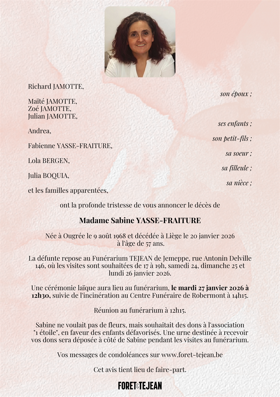 Décédée à Liège (4000) le mardi 20 janvier 2026 à l'âge de 57 ans