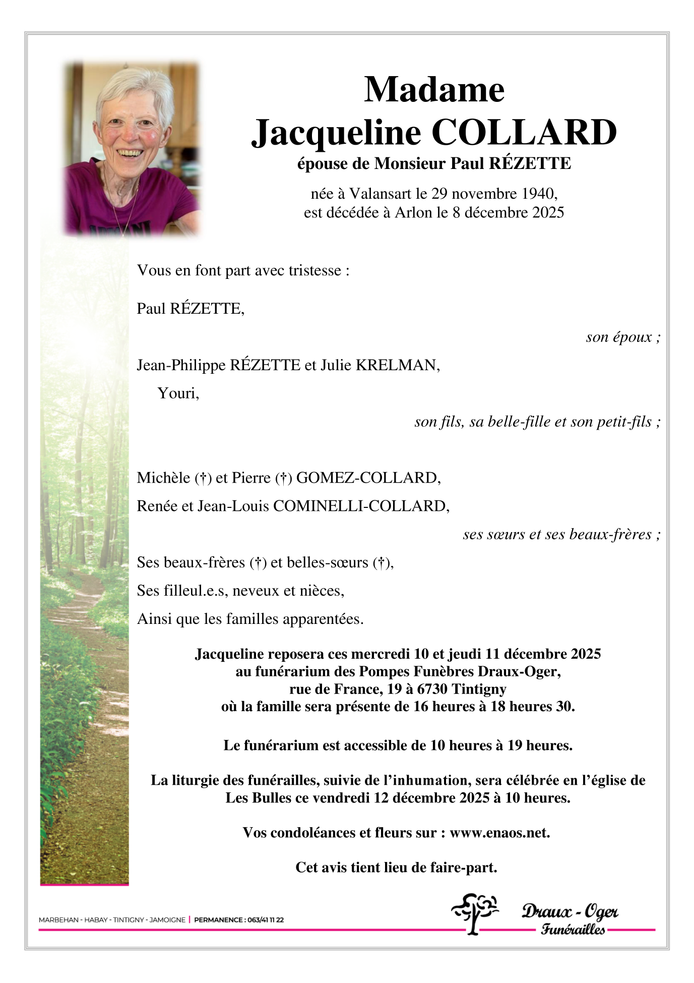 Décédée à Arlon (6700) le lundi 8 décembre 2025 à l'âge de 85 ans