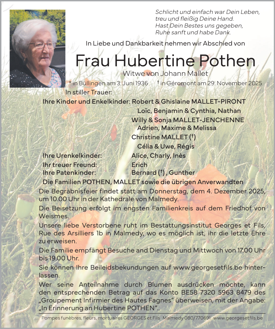 Overleden te Malmedy (4960) op zaterdag 29 november 2025 op 89-jarige leeftijd
