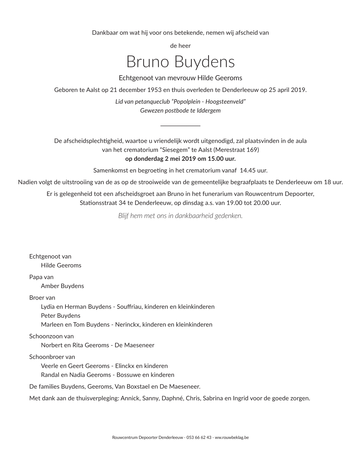 Overleden te Denderleeuw (9470) op donderdag 25 april 2019 op 65-jarige leeftijd