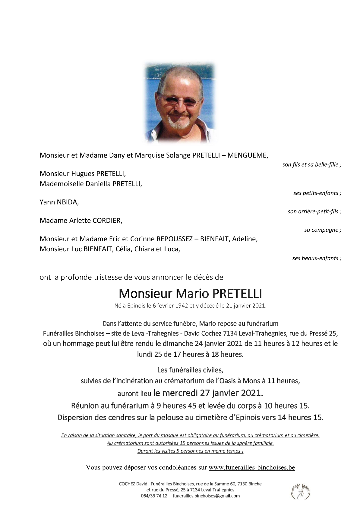 Décédé à Epinois (7134) le jeudi 21 janvier 2021 à l'âge de 78 ans