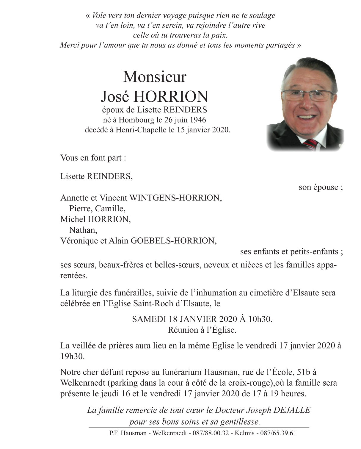 Fallecido en Henri-Chapelle (4841) el miércoles, 15 de enero de 2020 a la edad de 73 años
