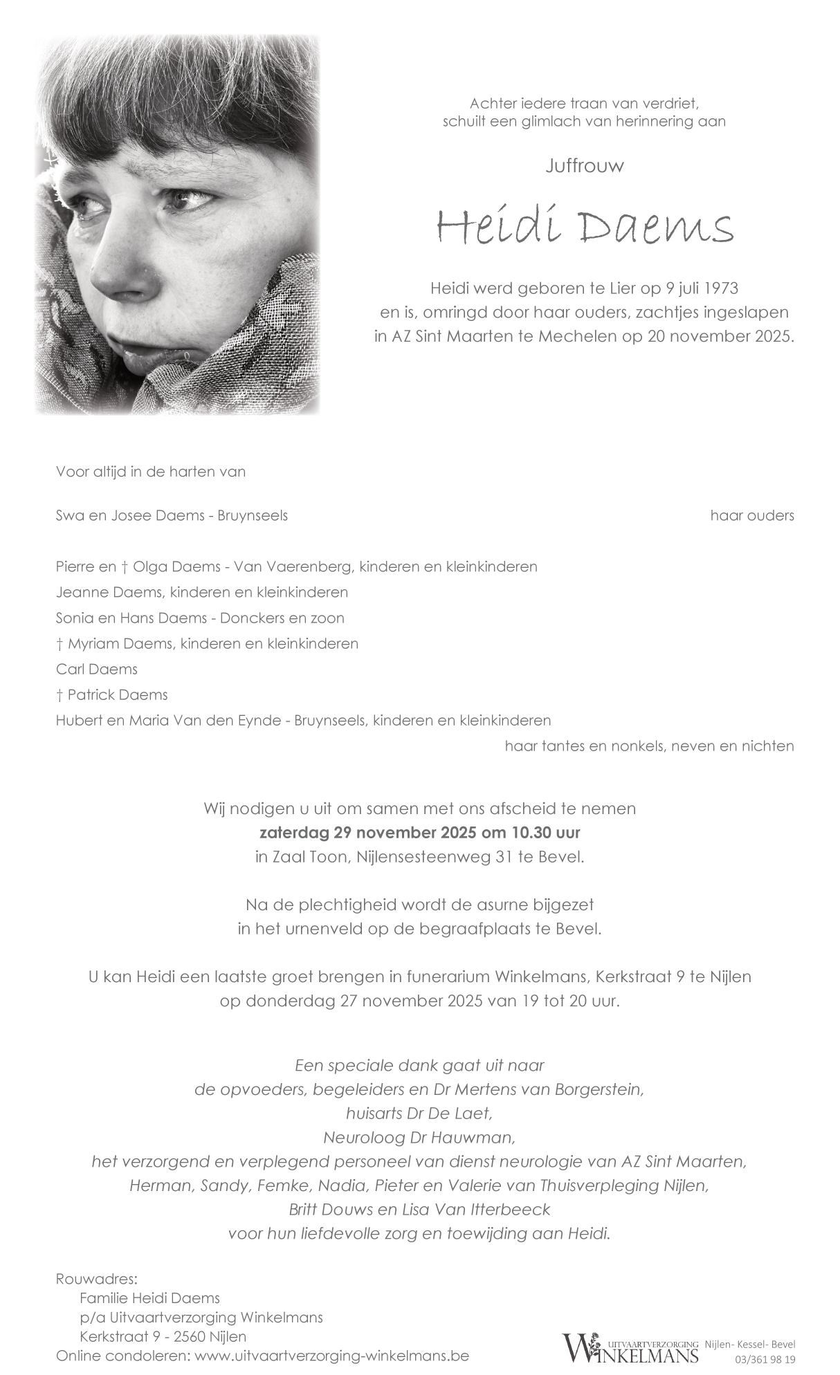 Décédée à Mechelen (2800) le jeudi 20 novembre 2025 à l'âge de 52 ans