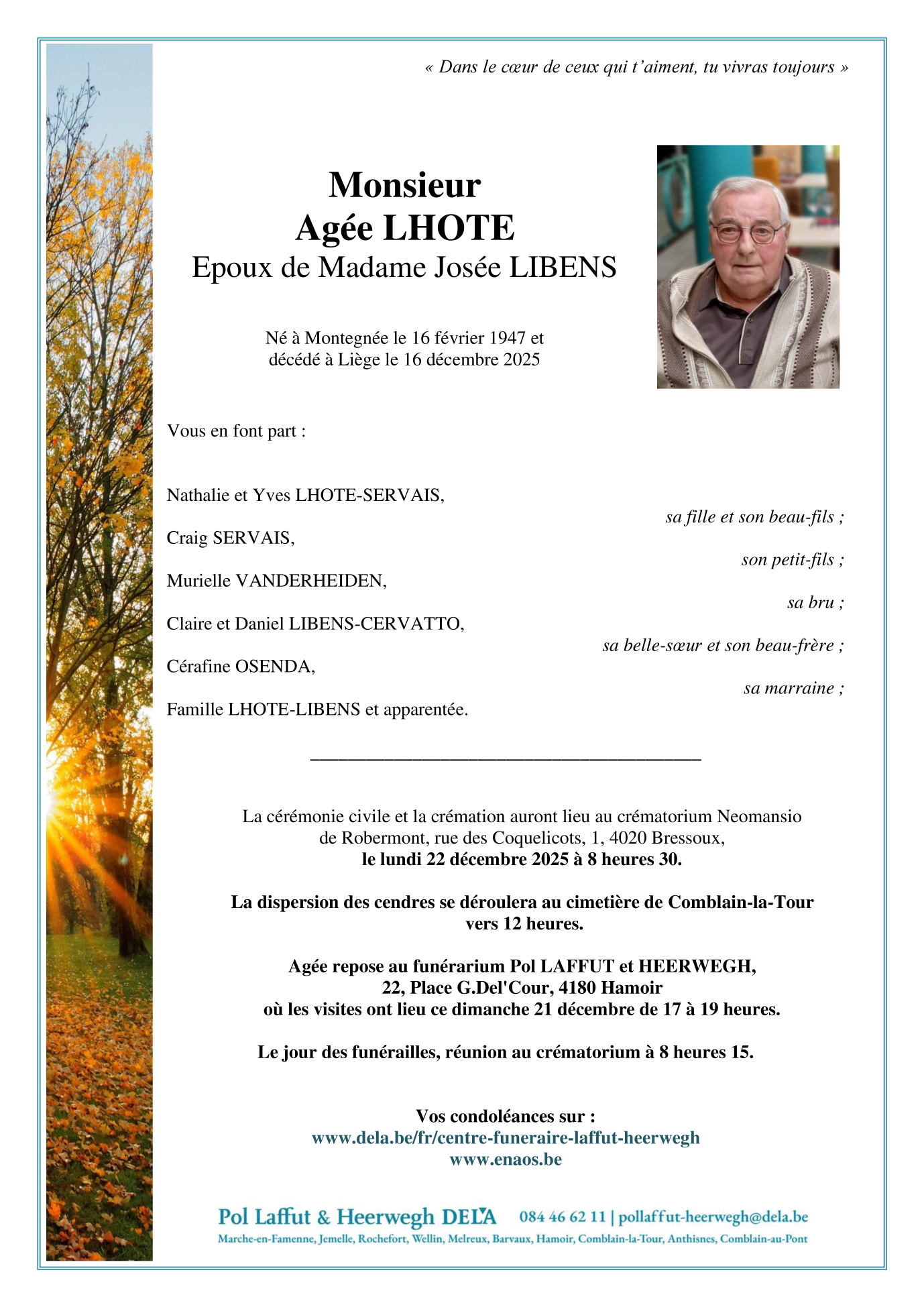Died in Liège (4000) on 16 December 2025 at the age of 78 years