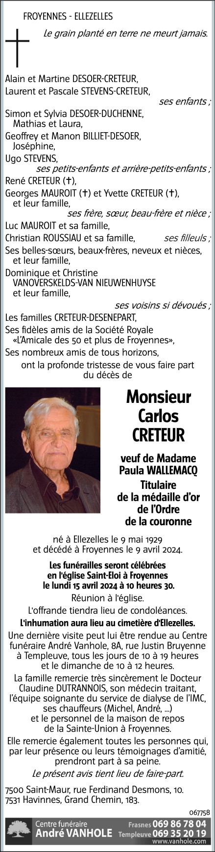 Fallecido en Froyennes (7503, Bélgica) el martes, 9 de abril de 2024 a la edad de 94 años