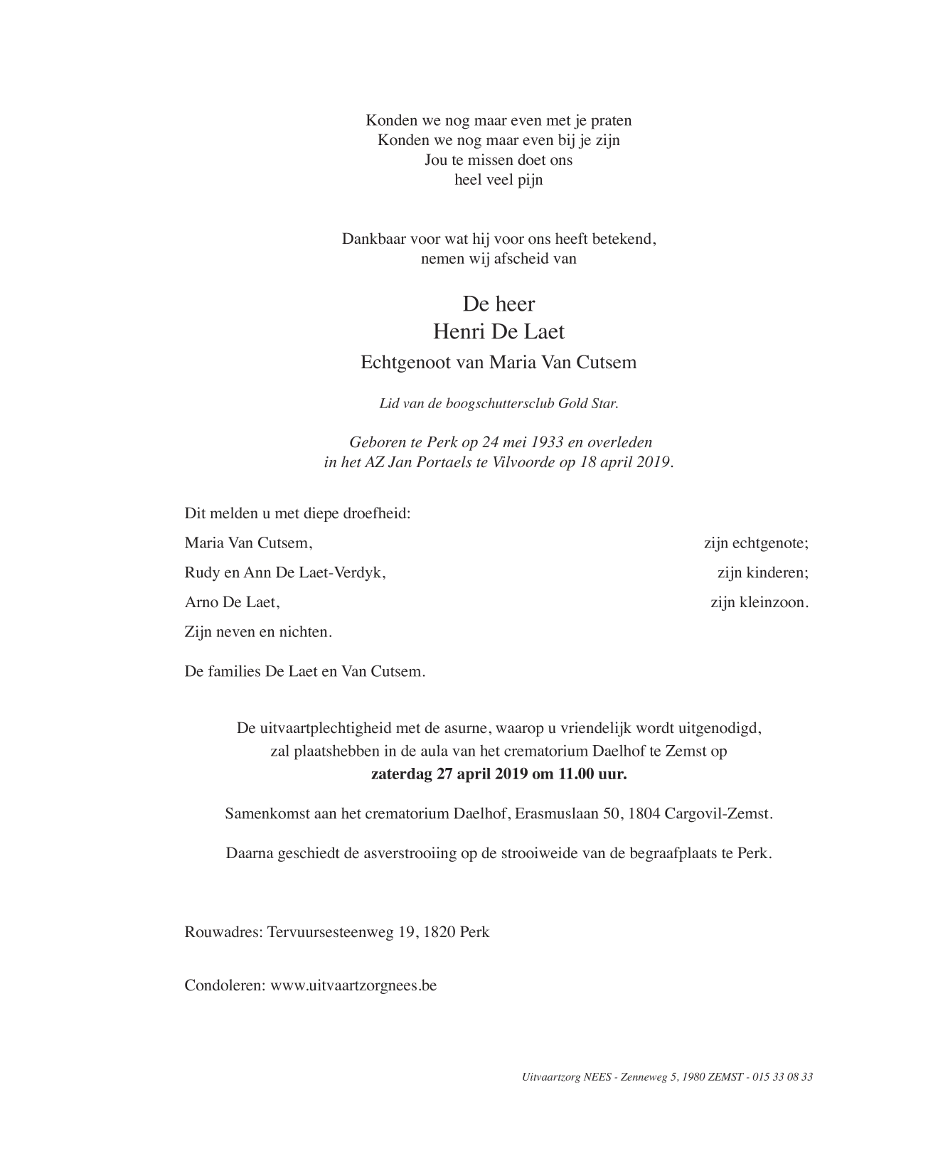 Décédé à Vilvoorde (1800) le jeudi 18 avril 2019 à l'âge de 85 ans