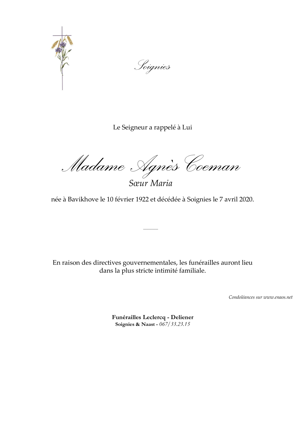 Décédée à Soignies (7060) le mardi 7 avril 2020 à l'âge de 98 ans