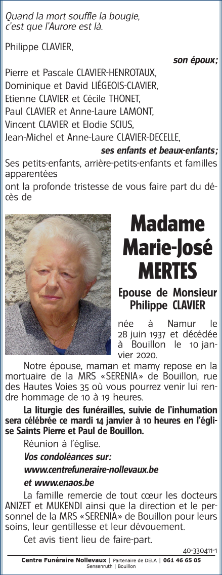 Décédée à Bouillon (6830) le vendredi 10 janvier 2020 à l'âge de 82 ans