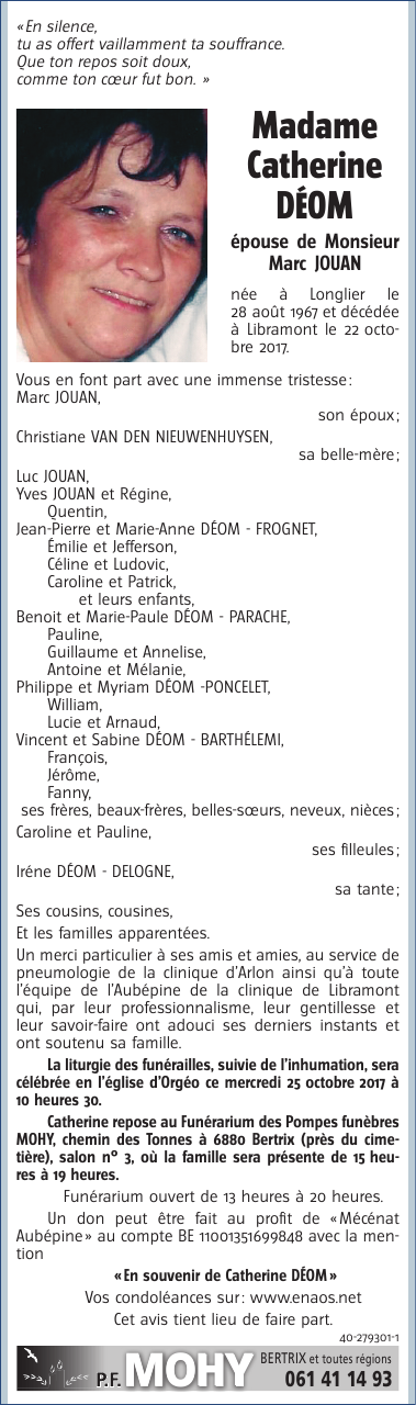 Overleden te Libramont (6800) op zondag 22 oktober 2017 op 50-jarige leeftijd