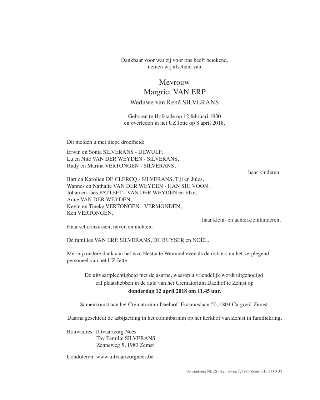 Décédée à Jette (1090) le dimanche 8 avril 2018 à l'âge de 88 ans