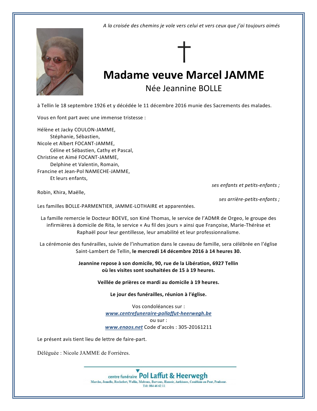 Décédée à Tellin (6927) le dimanche 11 décembre 2016 à l'âge de 90 ans