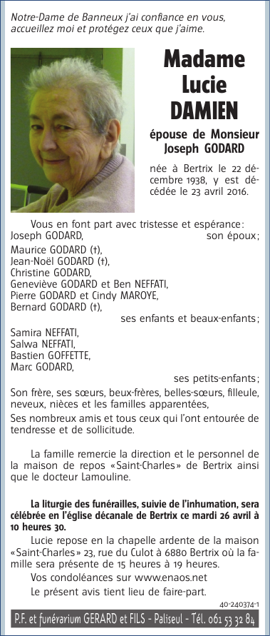 Fallecida en Bertrix (6880) el sábado, 23 de abril de 2016 a la edad de 77 años