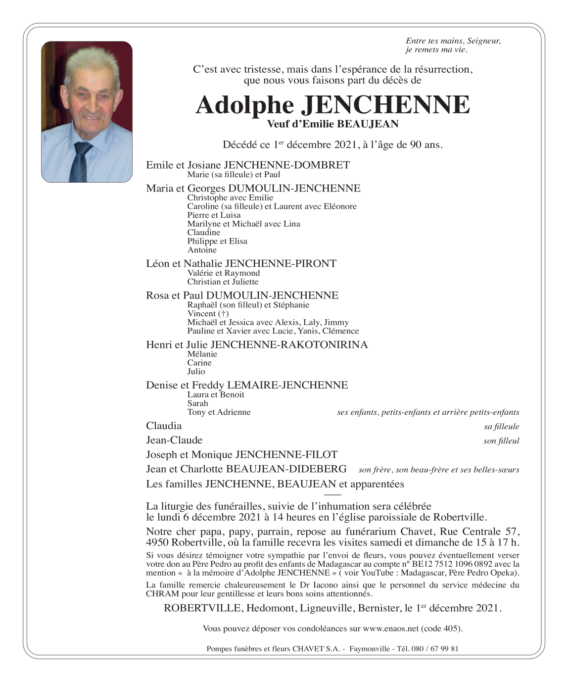 Fallecido en Malmedy (4960) el miércoles, 1 de diciembre de 2021 a la edad de 90 años