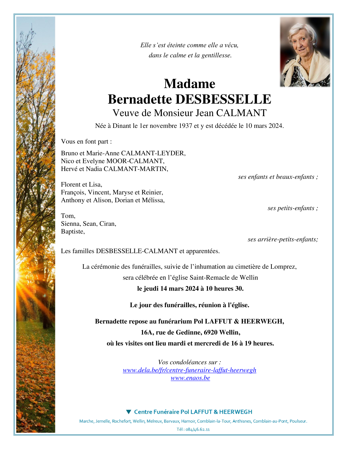 Overleden te Dinant (5500) op zondag 10 maart 2024 op 86-jarige leeftijd
