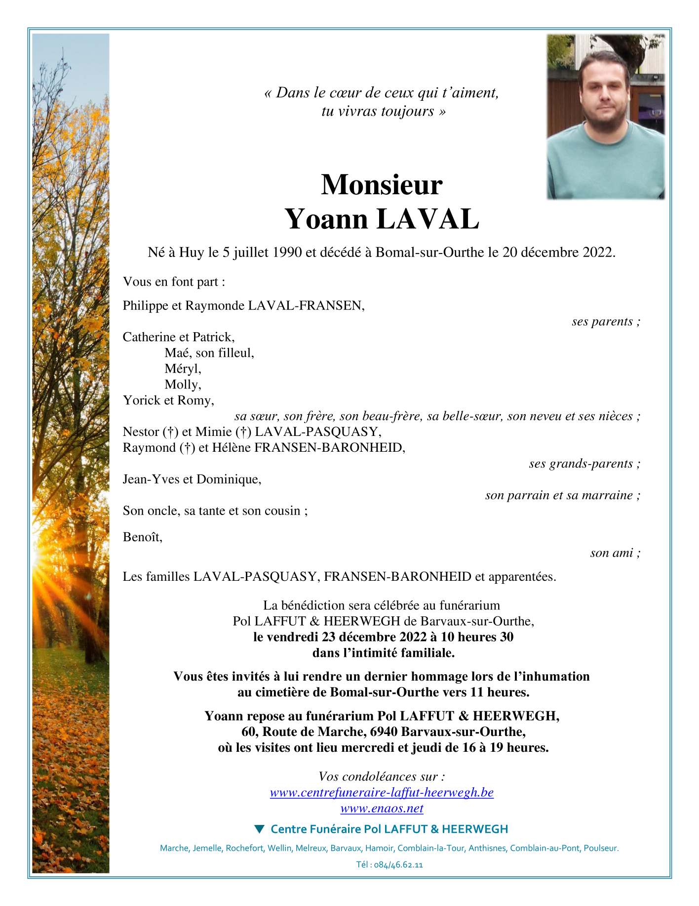 Décédé à Bomal-sur-Ourthe (6941) le mardi 20 décembre 2022 à l'âge de 32 ans