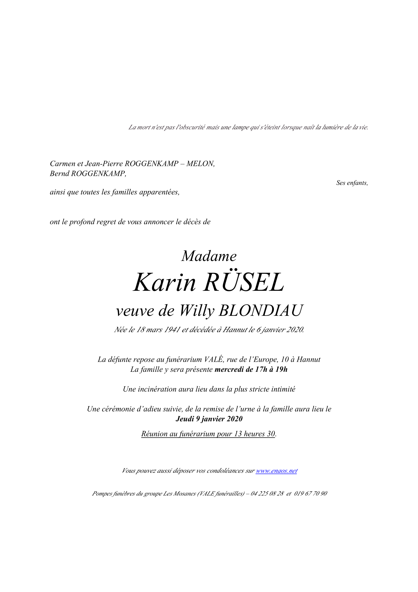 Décédée à Hannut (4280) le lundi 6 janvier 2020 à l'âge de 78 ans