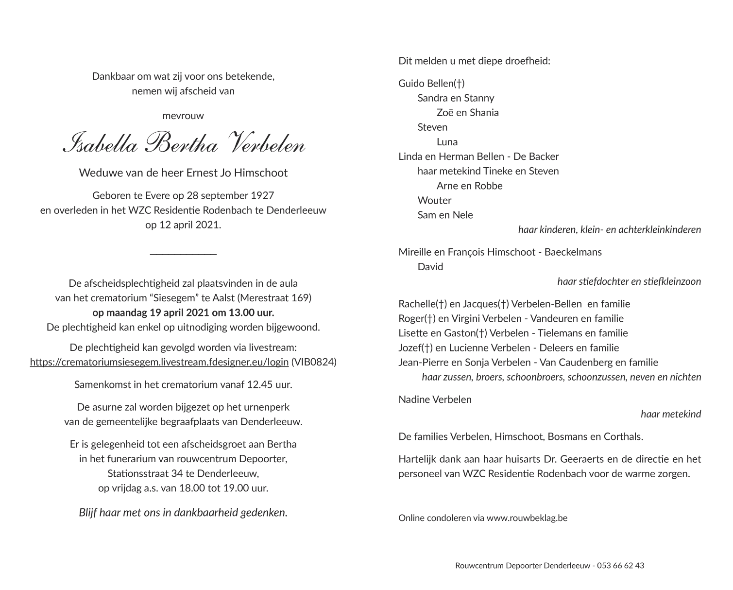 Overleden te Denderleeuw (9470) op maandag 12 april 2021 op 93-jarige leeftijd