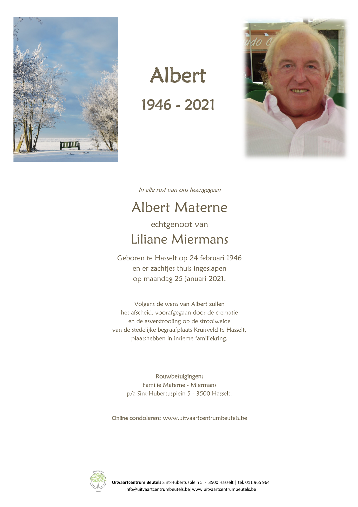Died in Hasselt (3500) on 25 January 2021 at the age of 74 years