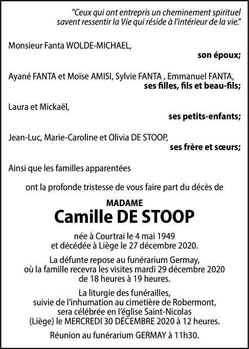 Décédée à Liège (4020) le dimanche 27 décembre 2020 à l'âge de 71 ans