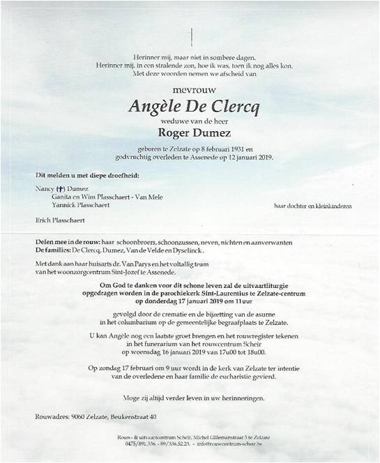 Overleden te Assenede (9960) op zaterdag 12 januari 2019 op 87-jarige leeftijd