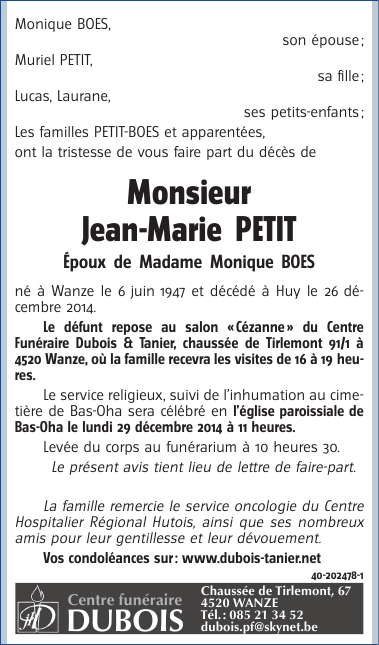Décédé à Huy (4500) le vendredi 26 décembre 2014 à l'âge de 67 ans