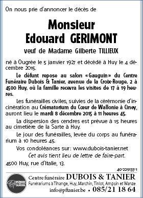 Décédé à Huy (4500) le vendredi 4 décembre 2015 à l'âge de 88 ans
