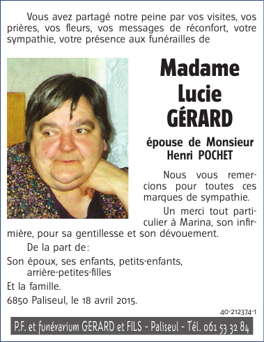 Fallecida en Paliseul (6850) el martes, 17 de marzo de 2015 a la edad de 73 años