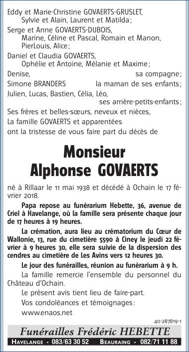 Décédé à Ochain (4560) le samedi 17 février 2018 à l'âge de 79 ans