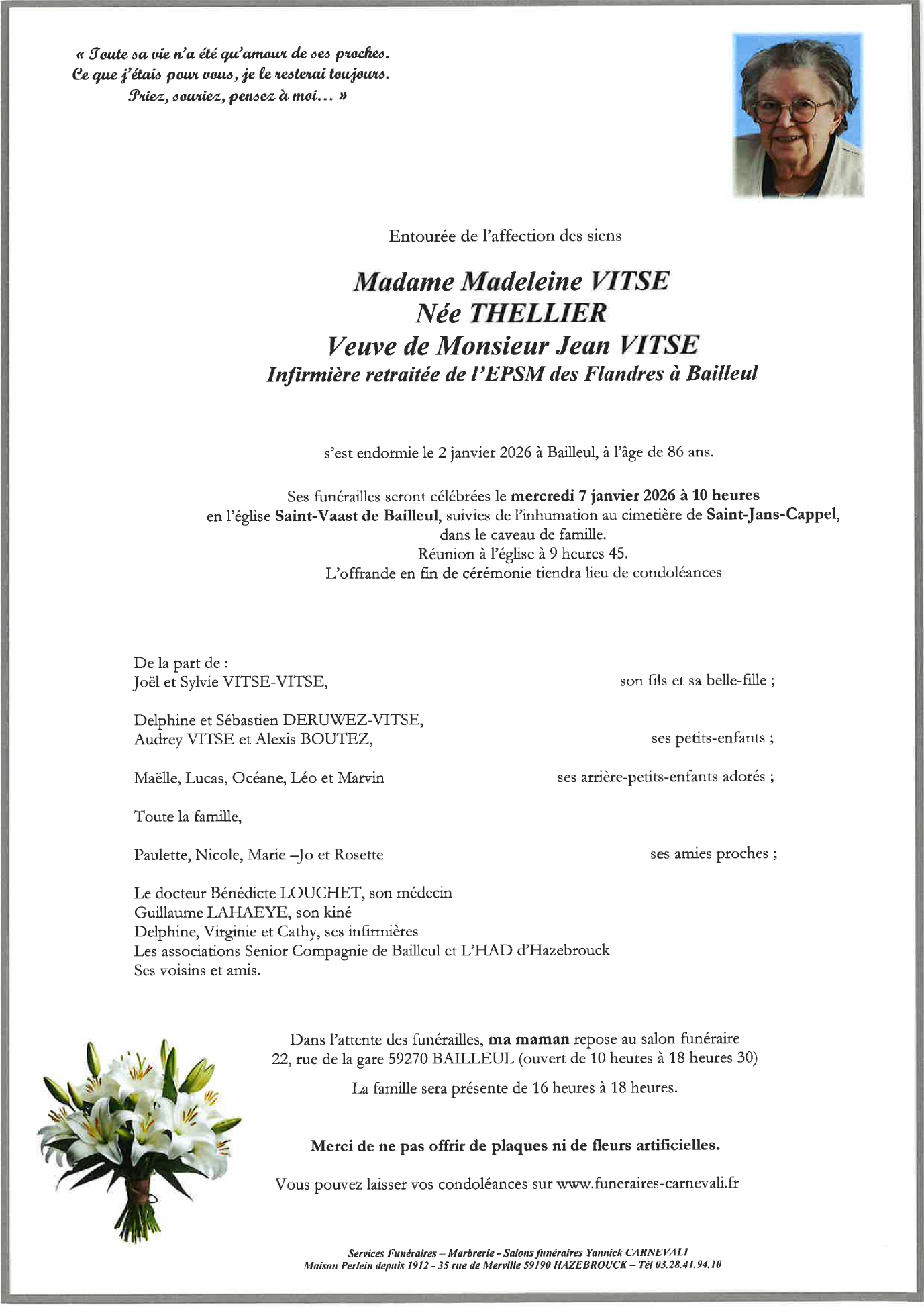 Décédée à Bailleul (59270, France) le vendredi 2 janvier 2026 à l'âge de 86 ans