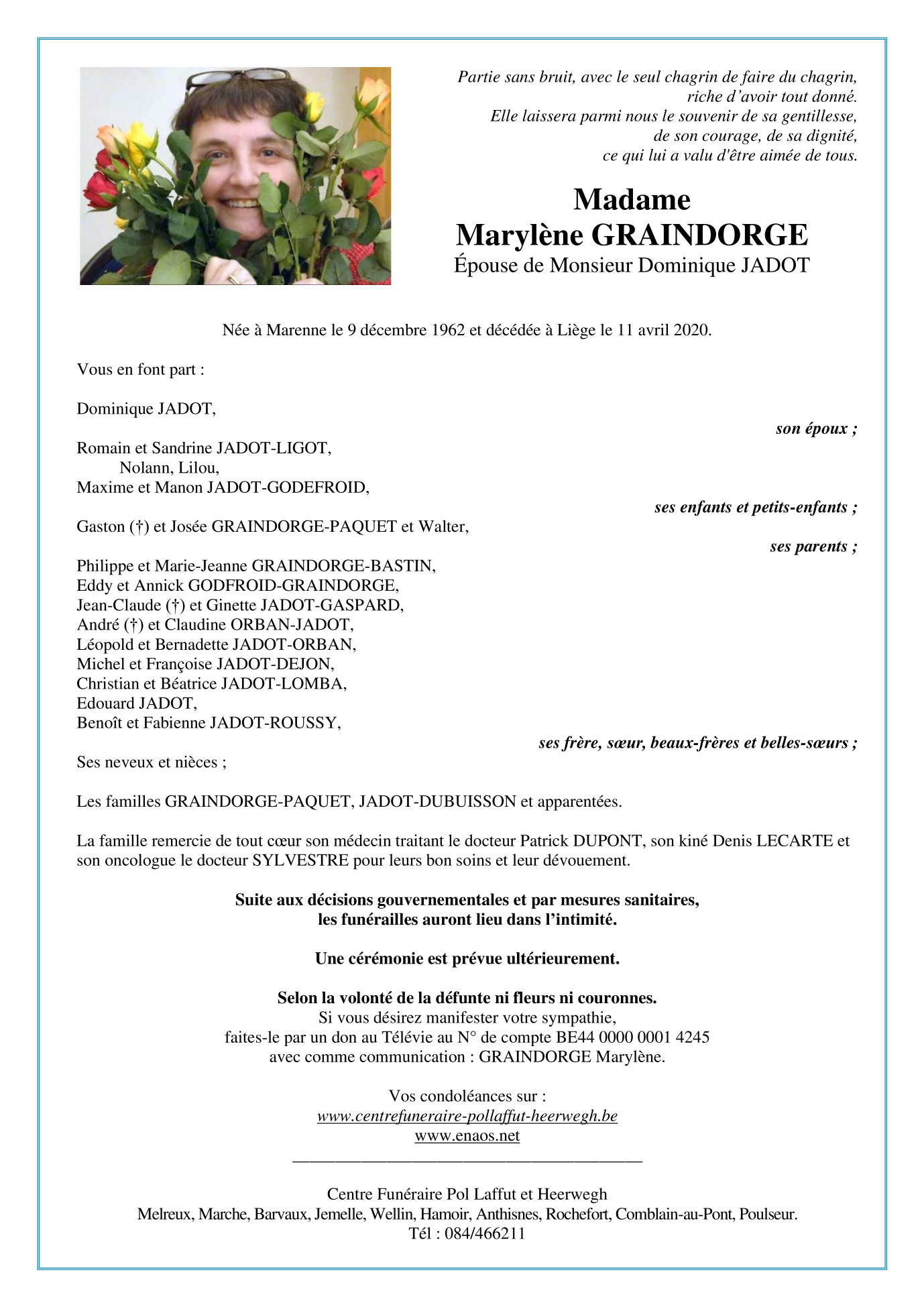 Décédée à Liège (4000) le samedi 11 avril 2020 à l'âge de 57 ans